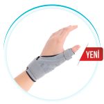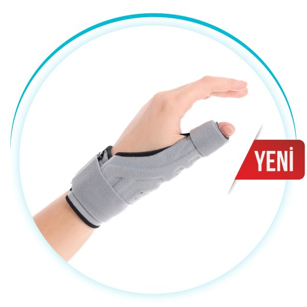 Anatomik yapıya göre tasarlanan baş parmak çevresini saran 1 mm şekillendirilmiş termoplastik desteği ile 1.mcp eklemi stabilize eden De Quervain atelidir.